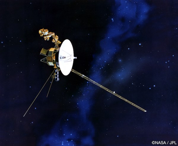 Voyager 1 fliegt aber mit 61'000 km/h immer weiter geradeaus durch das Weltall. An seiner Aussenhaut ist eine Botschaft angebracht für den Fall, dass er jemals mit intelligenten Wesen zusammentrifft. Die Botschaft ist auf einem goldenen Schild eingraviert, mit der schematischen Darstellung zweier Menschen Mann und Frau, die Position unserer Erde im interstellaren Raum relativ zu einigen Pulsaren und eine Schallplatte mit Musik und Geräuschen von der Erde. Auch wenn sein letzter Energievorrat ca 2025 aufgebraucht sein wird, wird Voyagers Reise mit der selben Geschwindigkeit weitergehen.